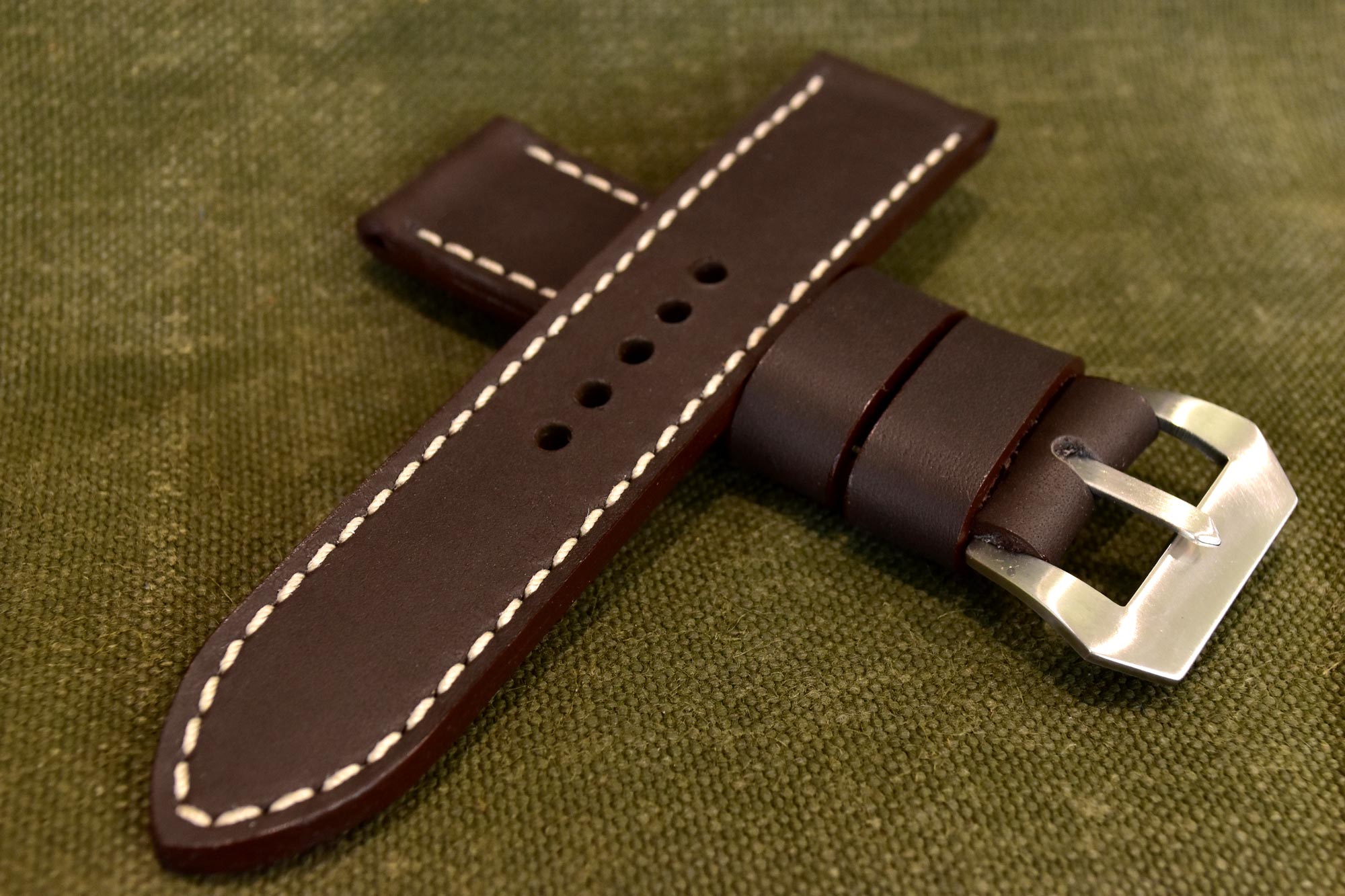 To describe Claymore as a very dark brown strap doesn't do it justice. The rich, deep chocolate brown of this strap is unmarred by texture or interruption, it's uniform and clean. A mellow temper to the leather makes it very comfortable to wear, and a pleasure to use.